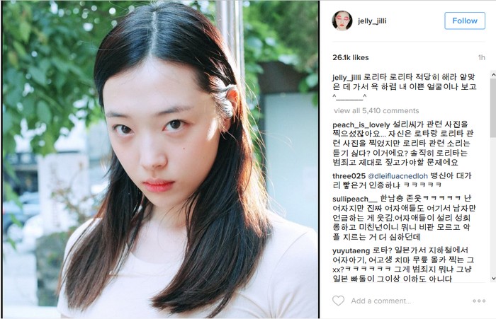 "Lolita, lolita. Sudah, sudah. Kritik saja di tempat lain dan cukup lihat wajah cantikku," tulis Sulli diakhiri dengan emoticon berbentuk senyum.