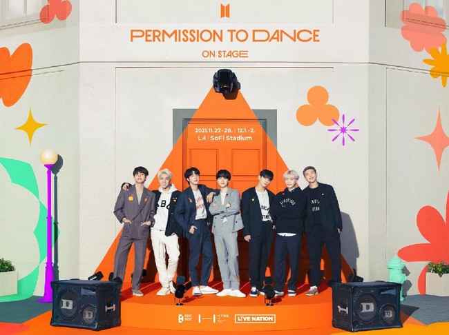 BTS yang akan gelar konser bertajuk Permission to Dance yang akan bertempat di SoFi Stadium, Los Angeles, Amerika Serikat. Konser tur pertama BTS pasca dua tahun pandemi ini akan dihelat selama empat hari mulai pada 27-28 November 2021 dan 1-2 Desember 2021.