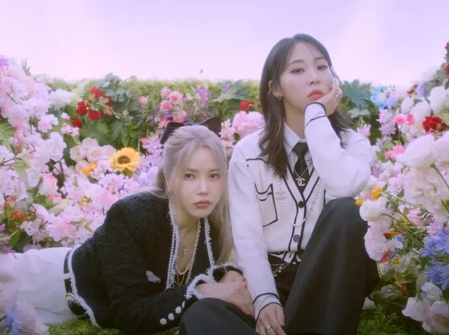 Solar tampil santai dengan kemeja longgar berwarna hitam yang membuat rambut pirangnya jadi terlihat mencolok dan bersinar. Di sampingnya, Moonbyul tampil santai dengan varsity biru-putih yang tak kalah kasual. Dua member MAMAMOO+ ini memancarkan pesona dan image yang berbeda namun keceriaan yang sama.