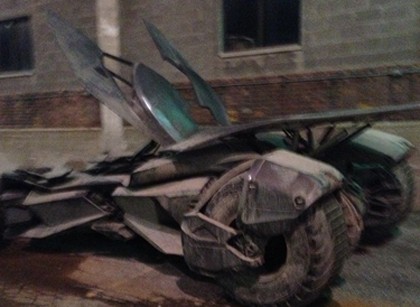Gambar ini diambil oleh penggemar dari atas gedung. Terlihat Batmobile yang terparkir dengan kondisi pintu terbuka. Di dalamnya terdapat seorang kru yang sepertinya tengah mengecek bagian dalam mobil.