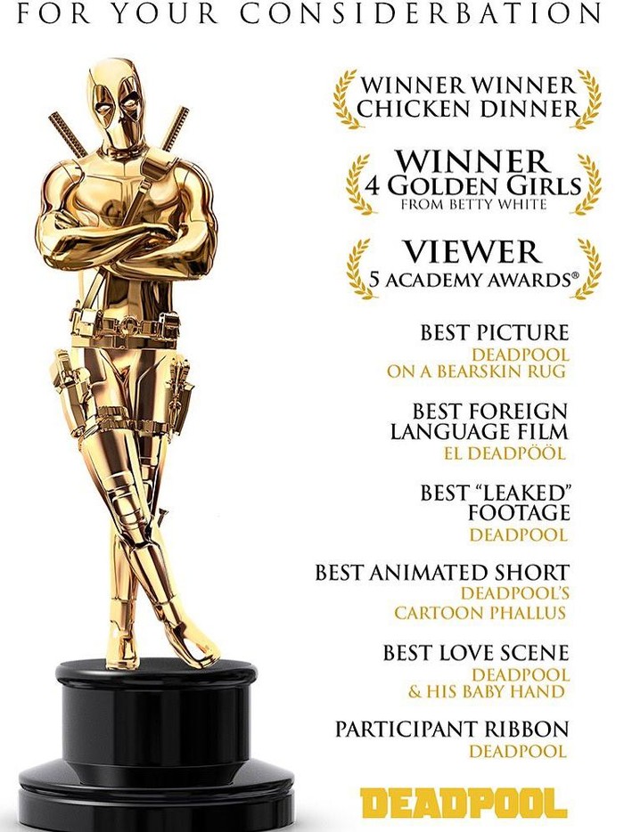 Tak hanya itu ia menambah keterangan di samping ikon piala tersebut dengan menuliskan kategori apa yang tepat bagi 'Deadpool' di nominasi Oscar. Di antaranya 'Best Leaked Footage' juga 'Best Love Scene'.