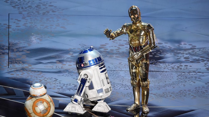 Tiga robot dari beberapa generasi film produksi Lucasfilm di antaranya R2-D2, C-3PO, juga teman baru mereka dari seri 'The Force Awakens', BB-8.