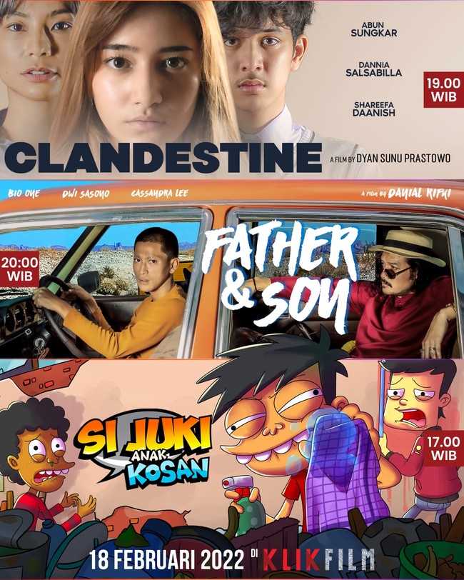 KlikFilm menghadirkan tiga film Indonesia secara ekslusif. Tiga film yang akan tayang pada bulan Februari 2022 adalah Father & Son, Clandestine, dan serial Si Juki Anak Kosan.