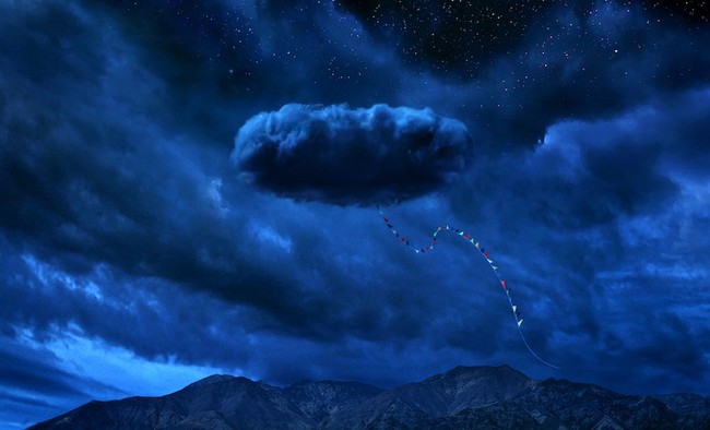 Seutas tali dengan bendera warna-warni seperti tersangkut di awan tersebut. Sementara di bawahnya dari kejauhan tampak cahaya lampu dari acara semacam festival atau pasar malam di sebuah kawasan di lembah.
