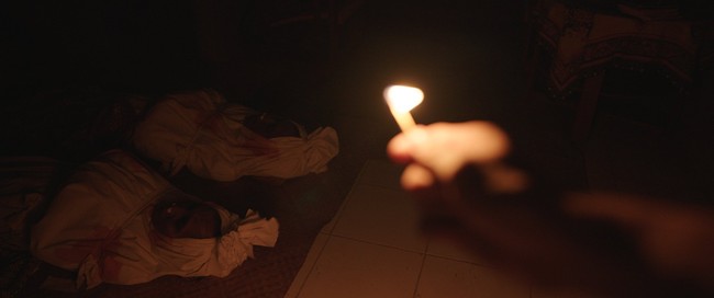 Dalam foto terlihat sebuah korek api kayu menyala yang sedang dipegang seseorang. Mengejutkannya, di hadapan orang tersebut terbaring dua pocong.