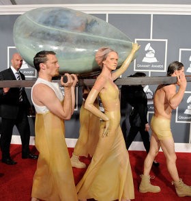 Pelantun 'Applause' itu datang menggunakan rumah telur yang dibawa oleh tujuh orang pria melewati red carpet. Ia sukses membuat heboh bahkan sebelum tampil di acara tersebut.