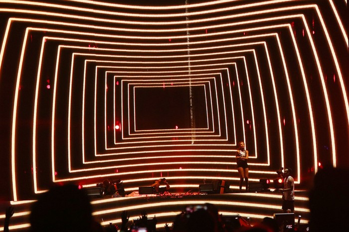 Di panggung utama, terdapat tiga layar besar yang memungkinkan visual apa saja hadir di sana. Menjakjubkan.