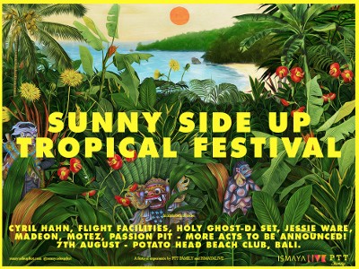 Tidak di Jakarta, Sunny Side Up Tropical Festival akan berlangsung di Bali dua hari sebelum WTF 2015. Tepatnya 7 Agustus di Potato Head Beach Club. Tiketnya dibagi ke dalam dua tipe, Yaitu Pre Sale Rp 910 ribu dan Advanced seharga Rp 1,1 juta. Lebih lanjut tentang Sunny Side Up Tropical Festival, langsung klik di sini.