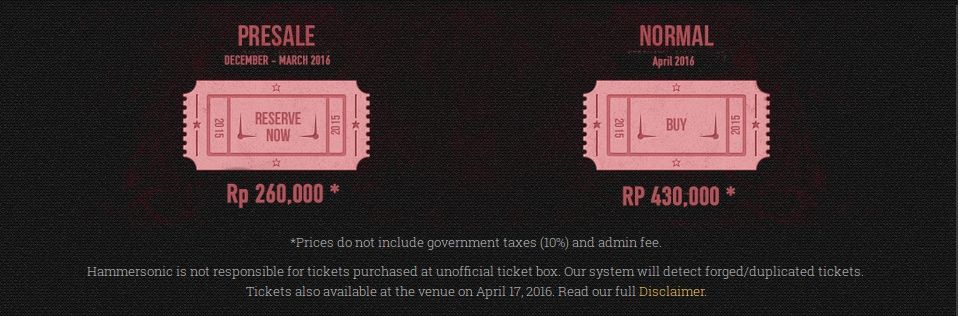 Tak seperti lokasi perhelatan yang masih 'disembunyikan', Hammersonic telah merilis harga tiket untuk periode pre sale. Tiket di periode tersebut dijual dengan harga Rp 260 ribu.