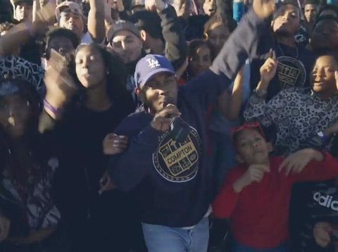 "ni**a, we gon' be alright.... ni**a, we gon' be alright," teriak mereka lagi. Terlihat latar belakangnya adalah Kawasan Compton, California, Amerika Serikat.