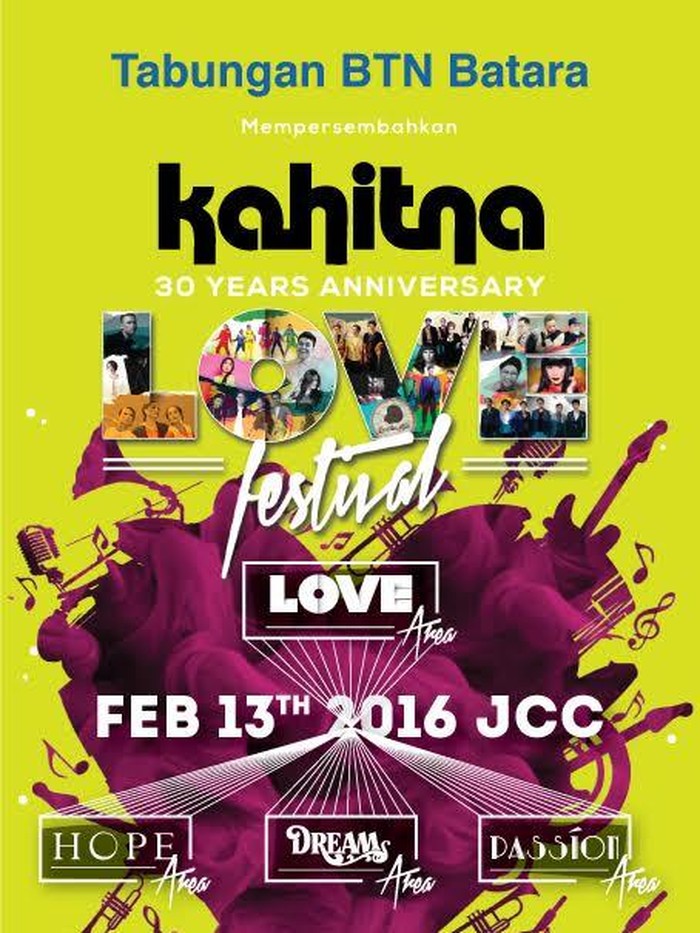'Kahitna 30th Years Anniversary Love Festival' akan digelar pada 13 Februari mendatang di Kawasan JHCC Plenary Hall, Jakarta. Berkonsep festival musik, gelaran tersebut memiliki empat panggung dan 20 musisi bintang tamu. Di antaranya, Titi DJ, Tulus, Raisa, Isyana Sarasvati, RAN, Maliq & D'Essentials, HiVi, Kunto Aji, Yura Yunita, Teza Sumendra, Project Pop, The Overtunes, The Groove, Rinni Wulandari & Jevin Julian, B3, Soulvibe dan 5 Romeo.