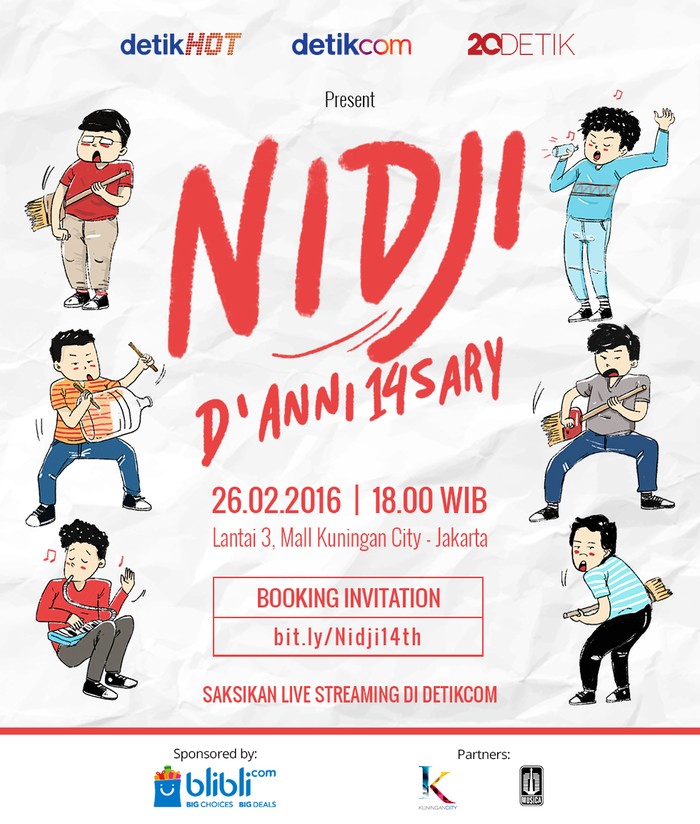 Yuk, masuk link ini untuk mendapatkan undangan menyaksikan 'NIDJIdAnni14sary' di Kuningan City pada 26 Februari mendatang. Selain itu, 'NIDJIdAnni14sary' juga akan di-live streaming di detikHOT dan detikTV.