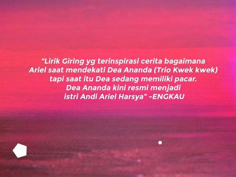 "Lirik @Giring_Ganesha yg terinspirasi cerita bagaimana @ArieLnidji saat mendekati Dea Ananda. #10TahunAlbumBreakthru," kicau akun resmi Nidji lagi.