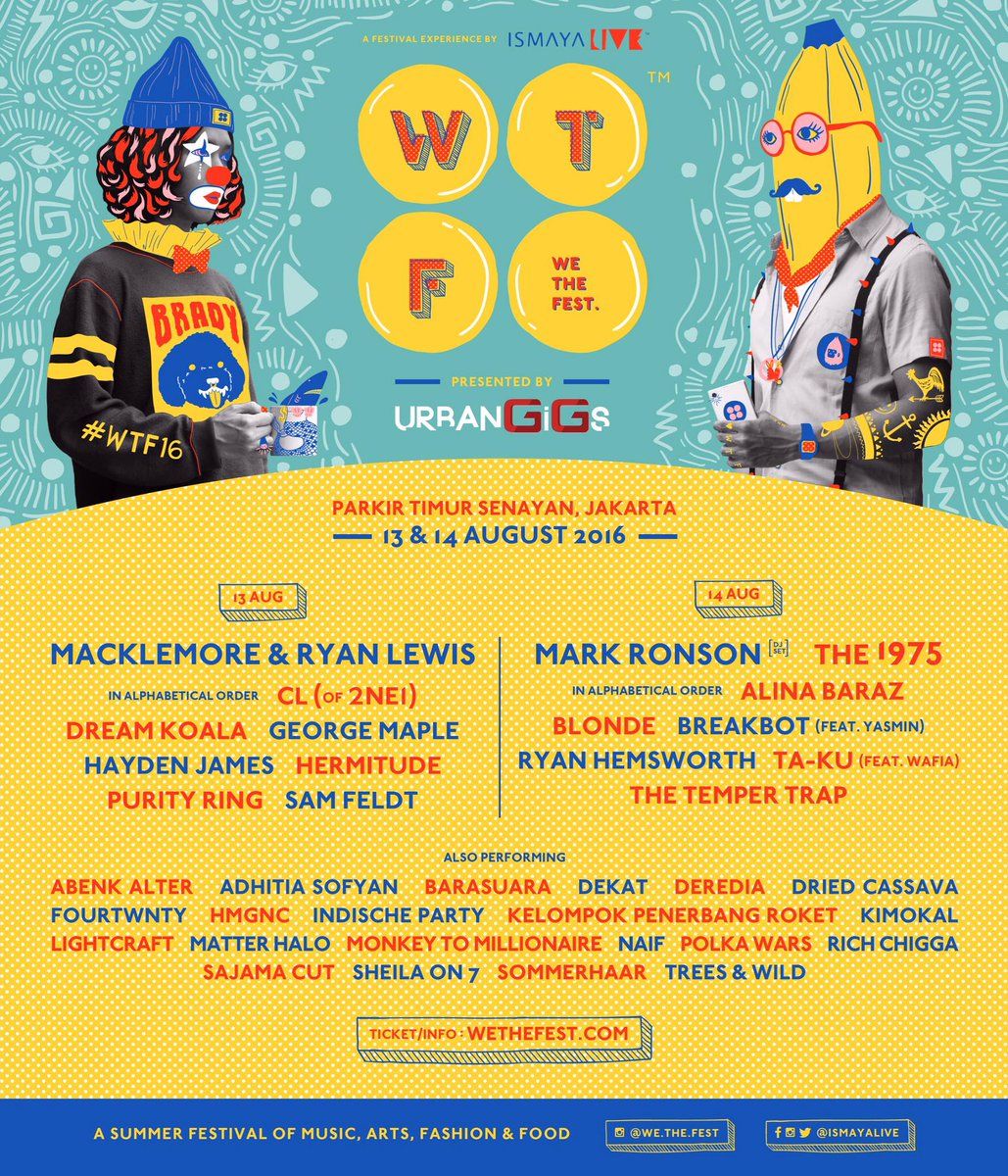 Sedangkan dari luar negeri, ada nama-nama seperti Macklemore & Ryan Lewis, Marko Ronson, The 1975, CL (2NE1), Breakbot, The Temper Trap, Blonde, Alina Baraz, Purity Ring dan banyak lagi. Akses langsung situs resmi WTF 2016 untuk mendapatkan informasi mengenai tiket.