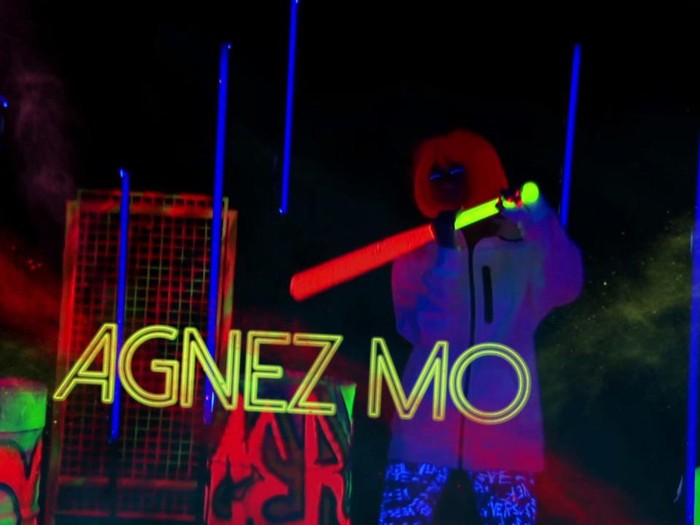 Tak hanya itu, di sisi lain panggung terdapat penampilan dari penari latar Agnez Mo yang basah-basahan dengan busana warna-warni dibalut dengan jas hujan.