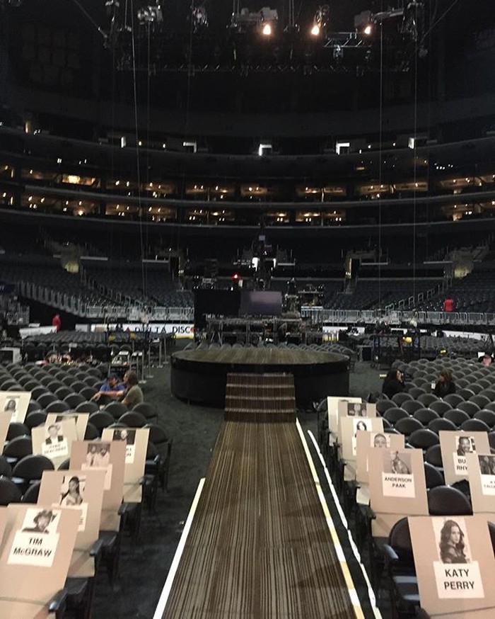 Panggung itu berbentuk lingkaran. Lokasinya berada di tengah-tengah venue di Staples Center, Los Angeles, Amerika Serikat.