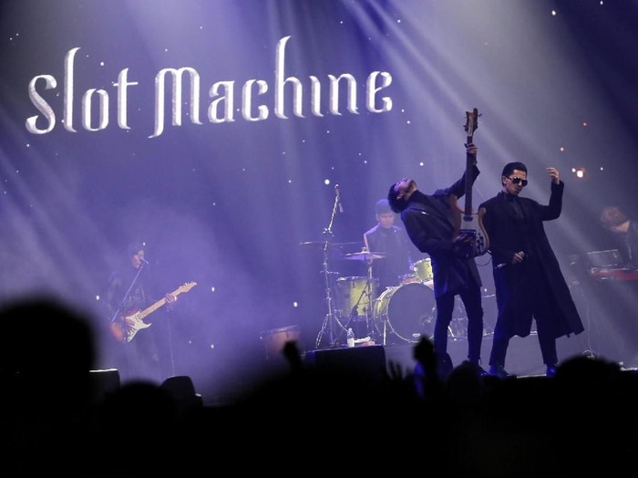 Slot Machine menjadi pembuka di konser yang bertempat di JIExpo Kemayoran, Jakarta Pusat, Jumat (12/10/2018). Mereka tampil energik sebagai pembuka. Para personel tampil dengan baju yang didominasi dengan warna hitam.