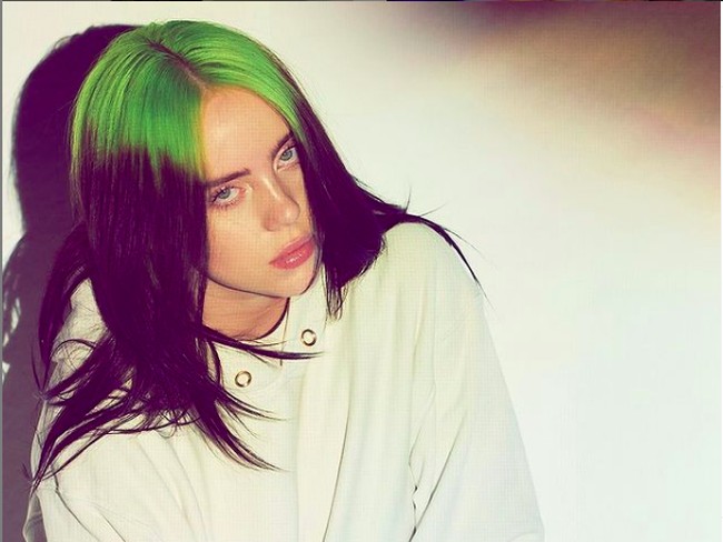 Tampak warna rambut hijau khas milik Billie Eilish dikuncir ke atas.