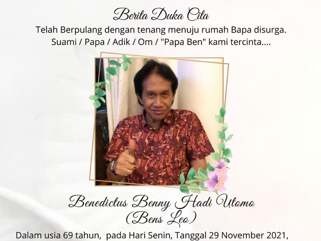 "Berita Duka Cita Telah berpulang dengan tenang menuju rumah Bapa di surga Suami/Papa/Adik/Om/"Papa Ben" kami tercinta.... benedictus Benny Hadi Utomo (Bens Leo)" buka pesan singkat tersebut.