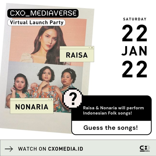 Gaya RnB khas Raisa dan sentuhan kental Jazz ala NonaRia ini akan berpadu dalam penampilan yang sayang untuk dilewatkan. Diketahui, keduanya akan memberi kejutan dengan membawakan lagu folk tradisional Indonesia. Penasaran? Saksikan langsung hanya di Virtual Launch Party CXO Mediaverse yang tayang hari ini mulai pukul 15.30 nanti!