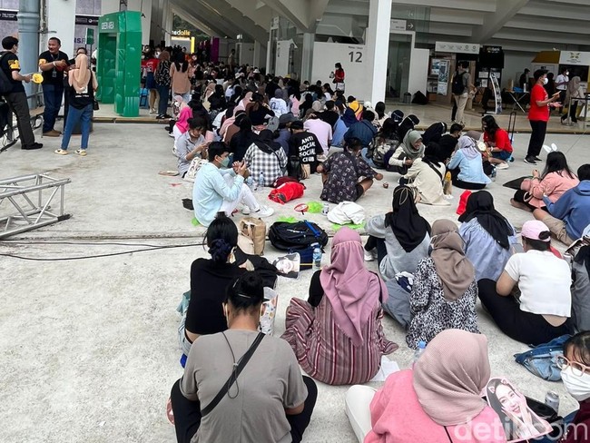 Mereka duduk antre dengan rapi dan mengular. Walaupun idolanya tampil masih malam nanti, mereka sudah hadir sejak pukul 3.00 pagi.
