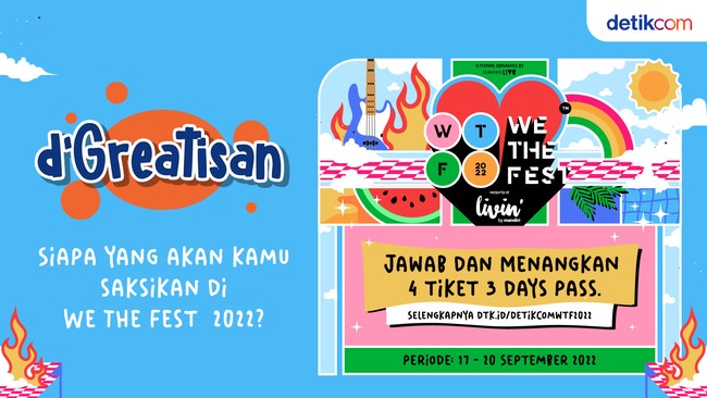 detikcom punya 4 tiket 3 days pass untuk 4 orang beruntung. Kuis ini berlangsung sejak artikel ini tayang hingga 20 September 2022. Pengumuman pemenang akan dilakukan pada 21 September 2022.
