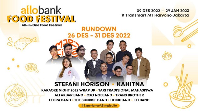 Mulai 19 Desember hingga 25 Desember, ada Dims the Meat Guy, Kunto Aji, Club Dangdut Racun, Stand Up Comedy, Trans Brothers, Community Performance hingga Karaoke Night bakal meramaikan Allo Bank Food Festival.