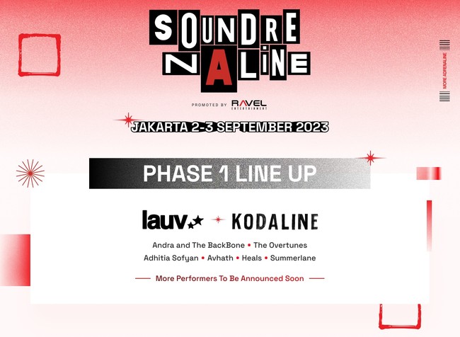 "Untuk fase pertama ini, kami umumkan dengan line-up internasionalnya yaitu Lauv dan Kodaline," kata CEO Ravel Entertainment Ravel Junardy selaku promotor Soundrenaline 2023, melalui keterangan resmi yang diterima detikcom, Kamis (6/4/2023).
