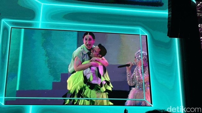 Nggak mau ketinggalan Nagita Slavina pun naik ke panggung dan langsung memeluk Raffi Ahmad. Penonton pun berteriak histeris karena merasa senang.