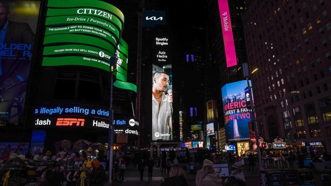 Musisi muda Aziz Hedra meraih kesempatan luar biasa dengan muncul lagi di Times Square, New York. Keberhasilan ini diraih setelah dirinya terpilih dalam proyek Spotify Singles, menjadikannya satu-satunya artis Indonesia yang wajahnya terpampang di Times Square.