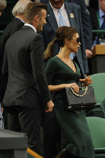 Victoria dan David Beckham menyaksikan pertandingan final Wimbledon di London, Inggris pada Minggu (8/7/2012). AFP PHOTO/Leon Neal.
