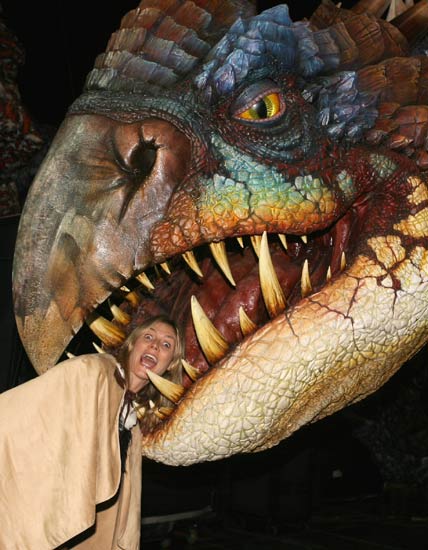 Heidi tampak menikmati waktunya dengan berpose 'digigit' seekor 'naga Nadder'. Kevin Kane/Getty Images.