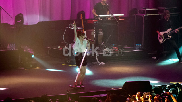 Jakarta - Pada Senin (27/5/2013), Carly Rae Jepsen sukses menghibur penggemarnya di Tennis Indoor, Senayan, Jakarta Selatan. Penyanyi berusia 27 tahun itu tampak centil melompat-lompat saat di atas panggung.