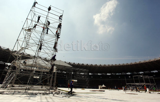Jakarta - Persiapan panggung konser Metallica sudah mulai terlihat di Stadion Utama Gelora Bung Karno, Senayan, Jakarta, Kamis (22/08/2013). Panggung sepanjang 60 meter lebih siap menyambut aksi mereka.