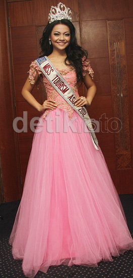Jakarta - Reinita Arlin Puspita terlihat menawan dibalut gaun pink saat ditemui di Gedung Sapta Pesona, kawasan Jakarta Pusat. Ditambah mahkota menghiasi kepalanya, Putri Pariwisata 2012 dan Miss Tourism Asia 2012 itu cantik layaknya seorang putri.