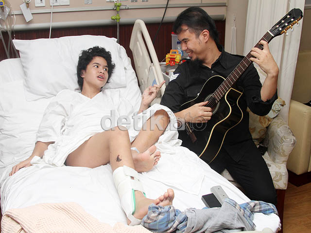 Jakarta - Pasca kecelakaan maut beberapa waktu lalu, Dul kini sudah dapat berjalan menggunakan tongkat. Selain itu, saat ditemui di rumah sakit, Senin (23/9/2013), Dul juga sudah bisa bermain gitar.