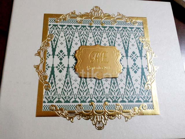 Β Β Β Β Di undangan pernikahan yang bernuansa putih, emas, dan hijau tua tersebut terdapat inisial nama Ayu dan Enji.