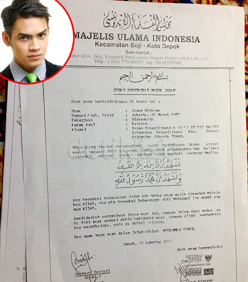 Β Β Β Β Surat pernyataan masuk Islam Jonas Rivano dari Majelis Ulama Indonesia.