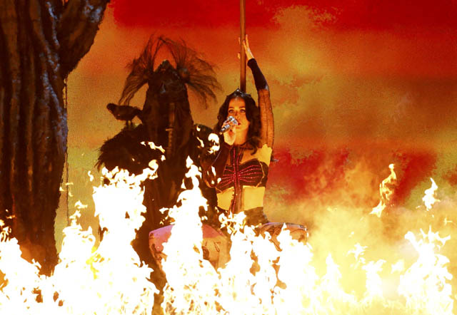 Katy Perry Membara di Panggung Grammy 2014 BAGIKAN URL telah disalin Katy Perry tampak membara dikelilingi kobaran api. Ia tampil seksi dengan busana hitam dengan aksen berwarna merah di bagian dada. REUTERS/Mario Anzuoni. Berkolaborasi dengan Juicy J, para penonton diajak untuk bernyanyi bersama. REUTERS/Mario Anzuoni. Set panggung dari Katy Perry di Grammy 2014. REUTERS/Mario Anzuoni.