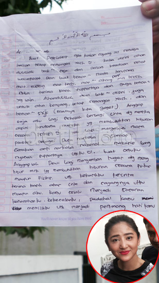 Jakarta - Dewi Persik (Depe) menitipkan sebuah surat pada sahabatnya, Indah Sari yang menjenguknya di Rutan Pondok Bambu, Jakarta Timur pada Jumat (21/2/2014). Apa isinya?