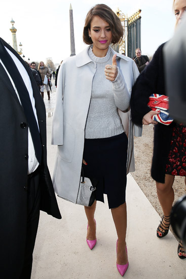 Mengenakan sweatshirt dan coat warna senada dan dipadu dengan rok pensil hitam serta sentuhan lipstik dan heels pink, Jessica Alba nampak mempesona. Pierre Suu/Getty Images.