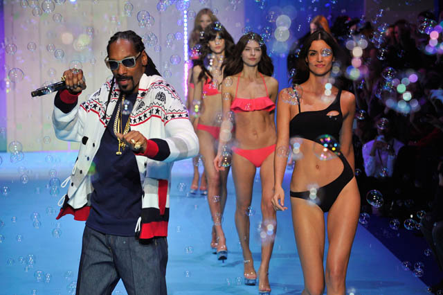 Turut meramaikan Etam show di Paris Fashion Week, Snoop Dog tampil eksis di runway bersama para model seksi. Kristy Sparow/Getty Images/detikFoto.