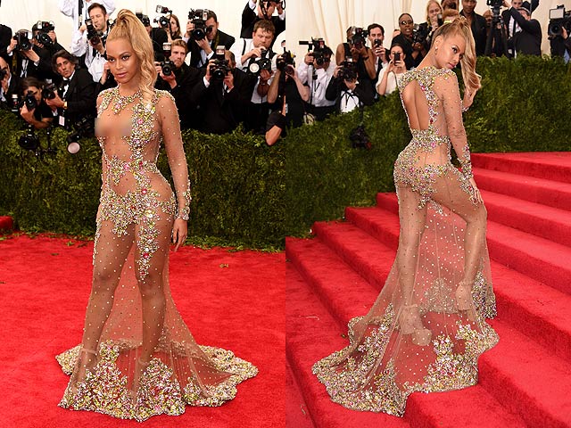 Beyonce superseksi dibalut busana transparan yang dihiasi dengan payet-payet penuh warna. Larry Busacca/Getty Images/detikFoto; Dimitrios Kambouris/Getty Images/detikFoto.