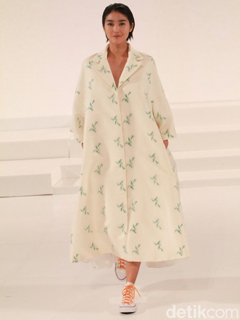 Model berusia 27 tahun itu coba padukan dress dengan sneakers. Pool/Gusmun/detikFoto.