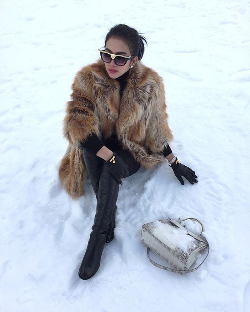 Saat bermain salju, ia juga tak lupa menenteng tas kesayangannya itu. (Instagram/princessyahrini)
