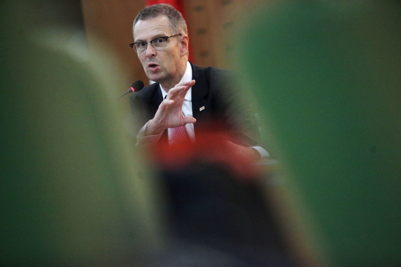 Direktur Business Development and Sales Marketing Sahid Hotels Group Vivi Herlambang, Dekan Fakultas Ilmu Kesehatan Universitas Kristen Satya Wacana Salatiga Ferry F Karwur, serta Deputi Direktur Bidang Akademi Riset dan Kemahasiswaan Universitas Paramadina Totok A Sofijanto memberikan keterangan pers.