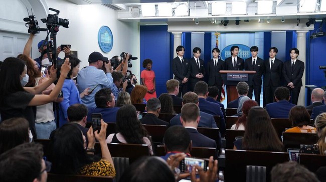 Supergrup pop Korea BTS muncul dalam sebuah konferensi pers di Gedung Putih Amerika Serikat pada Selasa (31/5/2022) waktu setempat, jelang pertemuannya dengan Presiden Joe Biden. AP Photo/Evan Vucci