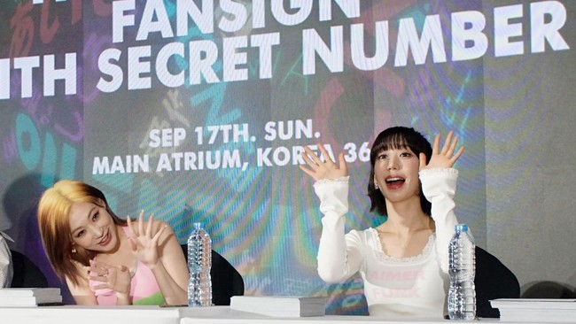 Personil Secret Number menyapa penggemarnya sebellum melakukan fans signing dan face to face di acara On The K:O yang digelar di Lotte Shoping Avenue, Jakarta.