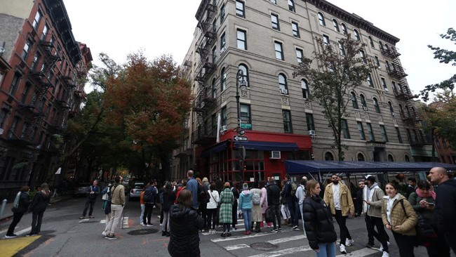 New York - Fans memenuhi gedung apartemen yang ditampilkan dalam sitkom 'Friends' yang dibintangi Matthew Perry. Mereka datang untuk memberikan bunga penghormatan.