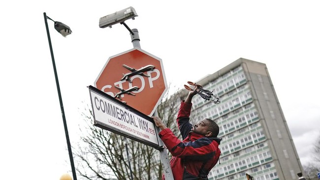 Seseorang mencuri karya seni Banksy, yang menunjukkan apa yang tampak seperti tiga drone di rambu berhenti lalu lintas, yang diresmikan di persimpangan Southampton Way dan Commercial Way di Peckham, London tenggara, Jumat 22 Desember 2023.